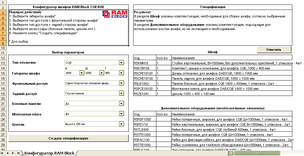 Теперь Вам достаточно всего лишь выбрать размеры шкафа и тип панелей. Так Вы легко получите готовую спецификацию собранного шкафа, а также совместимого с ним дополнительного оборудования.